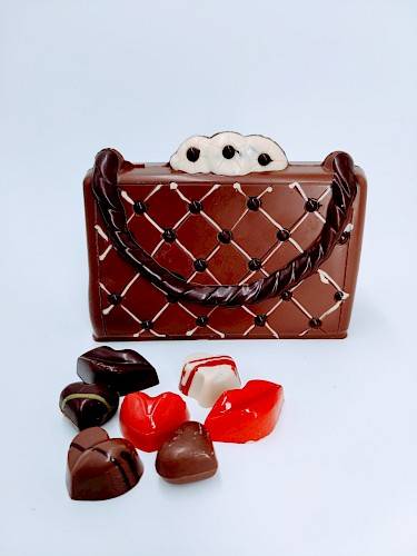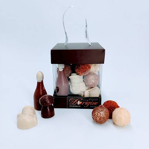 Eindejaarsaanbod met kogeltruffels (passievrucht, sinaaskaramel, champagne, koffie, vanillekaramel en speculoos), kerstmannetjes (praliné van amandel, hazelnoot of pistache), fles (champagne), kurk (nougat), kerstballetjes (gluhwein en advocaat) en kerststerren (limoen karamel en cuberdon).